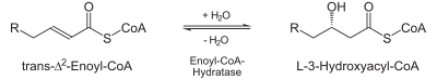 | Hidratare Etapa următoare este o reacție de hidratare ce are loc la nivelul legăturii duble dintre C-2 și C-3. Reacția este stereospecifică, formându-se doar izomerul L. | ![]() | enoil-CoA-hidratază | L-3-hidroxiacil-CoA |