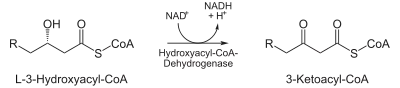 | Oxidare cu NAD+ A treia etapă este oxidarea L-3-hidroxiacil-CoA realizată de NAD+, astfel că grupa hidroxil (–OH) este transformată în carbonil de tip cetonă (=O). | ![]() | L-3-hidroxiacil-CoA-dehidrogenază | 3-cetoacil-CoA |