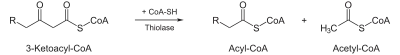 | Tioliză Ultima etapă este separarea 3-cetoacil-CoA de către grupa tiol a unei alte molecule de coenzimă A. Grupa tiol este inserată între C-2 și C-3. | ![]() | β-cetotiolază | O moleculă de acetil-CoA și una de acil-CoA cu doi atomi de carbon mai puțin |