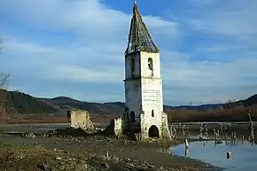 - Fosta biserică romano-catolică scufundată și reconstruită în mijlocul lacului