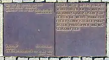 La câțiva ani după ce structura principală a memorialului a fost construită, o placă de bronz a fost încrustată în pavaj la câțiva metri distanță.[17] Gravat cu un citat din piesa autorului german-evreu Heinrich Heine, Almansor (1820), conține mesajul înfiorător:
