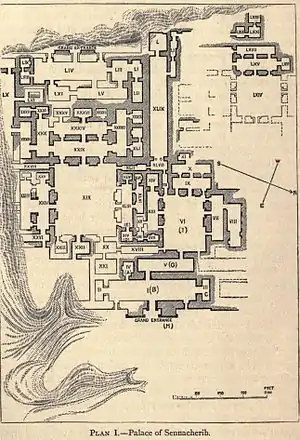 ![]() Plano del palacio de Senaquerib, donde se encontró la biblioteca. | |