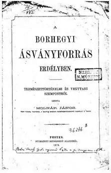 Pentru apele minerale din zăcământul Biborțeni, prima analiză fizico-chimică, atestată documentar, a fost făcută în anul 1871 (pentru exemplificare se oferă fig. 1. de mai jos situată în partea stângă) . Această analiză a fost făcută la Budapesta în anul 1871 de chimistul Molnar Janos, în calitate de membru al Societății de Științe Naturale Maghiare, și se referă la izvorul Borhegyi.