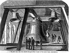 Cum turnul nu era încă terminat, clopotul a fost instalat în curtea Palatului Westminster. Turnat în 1856, primul clopot a fost transportat la turn pe un tren tras de șaisprezece cai, avansul său lent fiind observat și aclamat de mulțime. Din păcate, în timpul probelor, clopotul a crăpat, nu a mai putut fi reparat și s-a făcut un altul nou. Clopotul a fost turnat din nou la Whitechapel Bell Foundry (turnătoria de clopote Whitechapel) cu o masă de doar 13,76 t.[n 1] Acesta a fost ridicat 60 m până în clopotnița turnului cu ceas, efort ce a necesitat 18 ore. El are 2,2 metri înălțime și 2,9 metri lățime. Acest nou clopot a bătut pentru prima oară în luna iulie 1859. În septembrie și el a crăpat sub ciocan, la doar două luni după intrarea în uz. Directorul turnătoriei, George Mears, l-a acuzat pe Denison că a utilizat un ciocan de peste două ori mai mare decât masa maximă specificată.[3] Timp de trei ani, Big Ben a fost oprit și ora fixă a fost bătută de clopotul mic cel mai de jos până la reinstalarea clopotului. Pentru reparații, s-a extras o bucată de metal din jurul crăpăturii, iar clopotul a fost rotit cu 45° pentru ca noul ciocan să lovească în alt loc.[3] Sunetul clopotului Big Ben a sunat de atunci într-un fel neobișnuit și este încă utilizat astăzi cu tot cu crăpătură. La turnare, Big Ben era cel mai mare clopot din insulele Marii Britanii până la turnarea lui „Great Paul”, un clopot de 17 tone aflat în catedrala Saint Paul din Londra, în 1881.[27]
