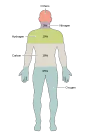 Doar șase elemente—carbonul, hidrogenul, azotul, oxigenul, calciul și fosforul—alcătuiesc aproximativ 99% din masa celulelor vii, incluzându-le și pe cele din corpul uman. În plus față de aceste șase bioelemente majore care compun corpul uman, mai sunt necesare în cantități mici încă 18 elemente. Elemente chimice care se regăsesc în cantități extrem de mici, microelementele, reprezintă un procent de aproximativ 0,074% din materia vie.[5]