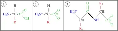 În urma unei reacții de deshidratare, are loc eliminarea unei molecule de apă și legarea a doi aminoacizi, identici sau diferiți, proces prin care se formează o legături peptidică. Molecula ce se obține se numește dipeptidă, iar moleculele formate prin unirea mai multor aminoacizi se numesc oligopeptide și respectiv polipeptide, după caz. Astfel, proteinele sunt macromoleculele formate prin unirea unui număr foarte mare din acești aminoacizi. De exemplu, albumina serică umană conține 585 de resturi de aminoacizi.[14]