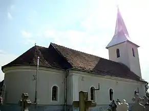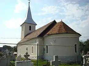 Biserica are un plan dreptunghiular alungit, cu absida semicirculară; i s-a adăugat ulterior un turn-clopotniță cu două etaje. Despărțirea naosului, destinat bărbaților, de pronaosul dedicat femeilor, este mai clară la această biserică, în general ea fiind mai puțin evidentă. Lângă intrarea în biserică se află o troiță din piatră, zugrăvită de către meșterul localnic Matei Purcariu „Țimforea”[2].