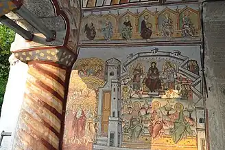 Biserica ridicată la 1819-1820 de către stolnicul Constantin Borănescu și soția sa, Anca Borănescu, fiica lor Elena Borănescu precum și biv vel serdar Nica Vlădescu. Pictura datată în același timp cu lăcașul de cult a fost realizarea zugravului Gheorghe și a ucenicului Iancu - nume distinse în proscomidie (masă sau firidă în peretele de nord al altarului unde se săvârșește proscomidia, e o ceremonie pregătitoare euharistiei, ce constă în depunerea - și eventual tăierea - pâinii și a vinului pe vasele de cult, și în ofertoriul propriu-zis, are loc înainte de proclamarea cuvântului).