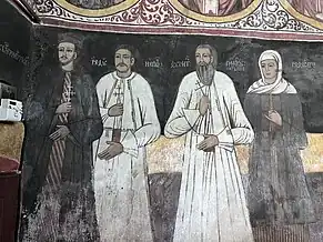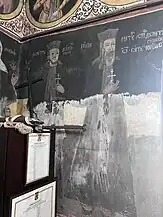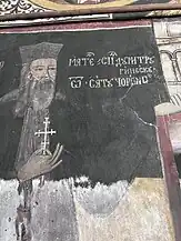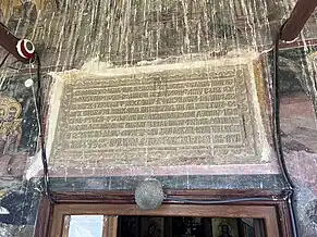 Pisania, care conține informații despre ctitori și data construcției, are următorul conținut: „Această Sfântă și Dumnezeiască mănăstire a făcut-o din temelie Popa Matei Ghinescu ot. Cioroi, sin Dumitru Ghinescu, cu hramul mai marilor voievozi, Mihail și Gavriil și al tuturor sfinților îngeri, în zilele ale Prea Luminatului domn Ion Alexandru Ipsilante Vodă, și s-au început în luna iulie, în zilele 31, anul 1783, și s-a împodobit cu toată cheltuiala Sfinției Sale, după cum se vede lucrată și sfârșită în anul 1796”.