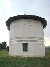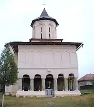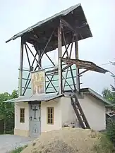 La vest de biserică se afla turnul-clopotniță, care avea și rol de turn de apărare în caz de război, ținând cont că biserica a fost ridicată în vremea lui Tudor Vladimirescu în târgul, cel mai mic din țară, Cerneți, dar cu cele mai multe biserici-fortărețe (4). Datorită stării avansate de degradare în locul lui a fost construită o clopotniță nouă[3].