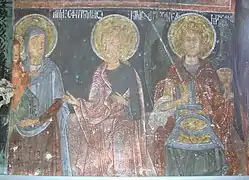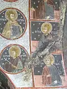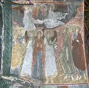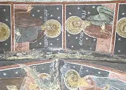 Cupola este decorată cu Iisus Pantocrator, Tronul Etimasiei[3], cete de îngeri, Iisus binecuvântând între episcopi, iar în pandantivi, evangheliștii. În pictura absidei se remarcă Dumnezeu Tatăl și Maica Domnului cu Iisus în brațe șezând pe tron. Arhanghelul Gavril, Prorocul Zaharia și Elisaveta cu Ioan, Dumineca Tomii, Înălțarea, Filoxenia lui Abraham[4], Arhanghelul Mihail, Prorocul Ioachim, Ana și Maria copil sunt scenele de pe arcul de răsărit al bisericii, Pe pereți apar scene precum Cina cea de taină, Iisus pe Muntele Măslinilor, Prohodul lui Iisus și Învierea.