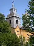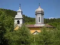 ![]() Biserica Armenească cu două turle, aflată lângă calea ferată, văzută din Monumentul Eroilor de pe Măgura Ocnei | |