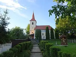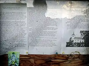 Pisania de la intrare: „Acest sfânt locaș cu hramul Buna Vestire s-a ridicat din temelie cu ajutorul material al bunului credincios Hagi Constantin Pop din Sibiu între anii 1798-1812. În urma stricăciunilor suferite din timpul războiului (septembrie 1944) biserica a fost reparată. Lucrarea de pictură a fost refăcută între anii 1963-1966 de pictorul Nicolae Stoica în colaborare cu pictorul Cazila Ioan pe timpul păstoririi preotului Teodor Goga”.