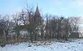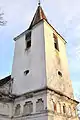 În privarul de la baza turnului se află o pictură originală în frescă reprezentând „Scoaterea lui Adam din Iad cu tot neamul lui”. Starea de conservarea lucrării e nesperat de bună, dar, din păcate, o crăpătură ce străbate fresca a fost grosolan acoperită cu ciment. Turnul bisericii rezervă și alte surprize celor care au norocul să urce în el: la cel de-al doilea nivel se află picturi în frescă, un mic altar și o inscripție cu litere chirilice, precum și mecanismul ceasului adus de la Viena, în 1910, de Vasile Greavu, fiu al satului[1].