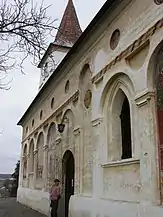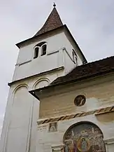 La exterior se remarcă cele două registre, întrerupte de un brâu; unele arcade și ocnițe au fost pictate[2].