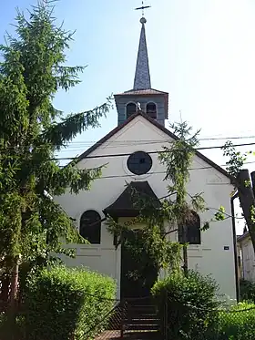 Deasupra intrării în biserică este scris cu caractere gotice(d) următorul text în limba germană: „Ein' feste Burg ist unser Gott”, „O cetate puternică este Dumnezeul nostru”, acesta fiind titlul unui cântec religios compus înainte de 1529 de Martin Luther (muzică și versuri).