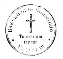 Ștampilă a Bisericii Mărturisitoare, cu deviza Teneo quia teneor (Țin, pentru că sunt ținut)