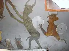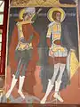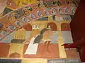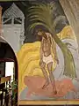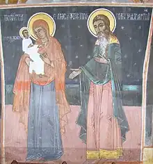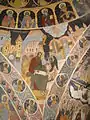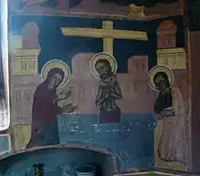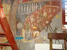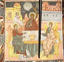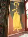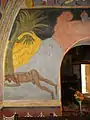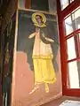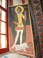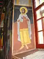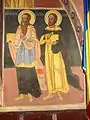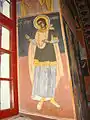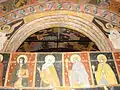 Deasupra intrării, pe turn, se găsește un chip al Maicii Domnului, pe tron, cu pruncul Isus în brațe, între doi îngeri zugrăviți întregi. În pronaos, în vârful cupolei, Maica Domnului, ridicând mâinile în sus, în atitudine de adorație. Pe pieptul Maicii Domnului, în medalion, pruncul Isus binecuvântând cu amândouă mâinile. De jur împrejurul Maicii Domnului sunt îngerii, grupați în cete, pe un paviment cenușiu, având la spatele lor bolta înstelată. Sub cetele îngerești, un șir de apostoli, despărțiți unii de alții prin coloane de arcadă. Pandantivii sunt ocupați de cuvioșii părinți: Andrei Criteanul, Ioan, Cozma și Ioan Damaschinul. Pe peretele nordic au fost înfățișate raiul și iadul, despărțite numai prin ambrazura ferestrei.