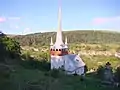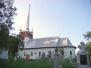 Biserica a fost construită în mijlocul cimitirului, pe locul unei bisericuțe din lemn. Deși nu se cunoaște cu exactitate momentul edificării ei un sprijin în datare îl reprezintă anul pictării bisericii, 1793, inscripționat pe bolta altarului. Materialele folosite la construcția bisericii au fost piatra și cărămida: piatra – la fundații, turn și pereții bisericii, iar cărămida – la bolțile din naos. Lemnul a fost utilizat la realizarea acoperișului bisericii, care a fost acoperită inițial cu țiglă și ulterior cu tablă, așa cum este și astăzi. Construcția se desfășoară în lungime pe 22,60 metri, cu 3 încăperi ale bisericii propriu-zise, altarul fiind îndreptat spre est, retras față de corpul bisericii cu aproximativ 0,75 metri, de-o parte și de alta. Altarul are o formă poligonală la exterior și semicirculară în interior; el are 4,40 m în lungime și 4,60 m în lățime. Naosul (nava) are 7,40 m în lungime pe 5,80 m, pronaosul are 4,40 în interior pe 5,80 m, iar turnul este de 4,20 pe 3,25 m. Intrarea e situată pe latura de sud a bisericii. Din pronaos există o ușă de acces spre turn și o alta spre naos. Pe jos, turnul are turnat ciment, iar în celelalte două încăperi (pronaos și naos) se află dușumea din scândură de brad. Se remarcă prin vechimea sa pavimentul altarului: acesta se compune din lespezi ceramice provenind fie de la castrul roman Potaissa-Turda, fie de la un alt punct fortificat roman, pe drumul Potaissa-Napoca; plăcile ceramice care formează pavimentul altarului păstrează încă inscripția „LVM”, adică „Legio V Macedonica”.