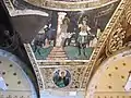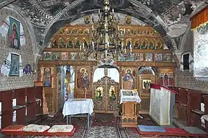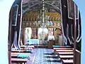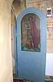 Pictura altarului este realizată în frescă; ea se compune din mai multe scene pictate, diferite tematic și cromatic. În centru se află scena Sfintei Treimi cu Dumnezeu-Tatăl înfățișat ca un bătrân cu barbă albă și Dumnezeu-Fiul, care poartă Sfânta Cruce în mâna dreaptă. Deasupra lor, într-un câmp de raze, porumbelul sfânt întregește scena. Pe partea descendentă a calotei se observă cu greutate, din cauza stratului gros de fum care acoperă pictura, figurate „Cetele îngerești”, care constitute și tema inscripțiilor cu litere chirilice de pe bolta altarului. Într-un câmp dintre două scene se poate citi anul 1793, an care atestă momentul realizării picturii sfântului lăcaș. Alte inscripții sunt ilizibile din cauza stării accentuate de degradare a stratului pictural. Probabil la o operațiune de curățare a picturii vor putea fi citite și aceste inscripții, care ascund probabil numele celui care le-a pictat.