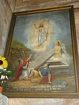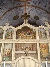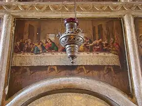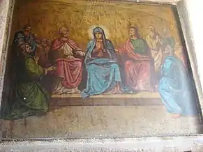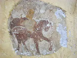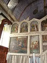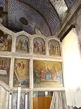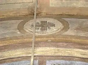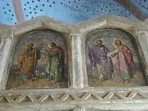 Zestrea de frescă păstrată este foarte săracă. Cu prilejul neinspiratelor lucrări de restaurare din perioada interbelică, o bună parte din picturi a dispărut; unele blocuri de piatră, păstrând urme de zugrăveală, au fost reutilizate, cu pictura spre exterior, la legătura făcută între altarul primei biserici și nava celei de a doua. Pe baza analizei stilistice a fragmentelor păstrate s-a constatat prezența a două maniere diferite de execuție. Frescele din naos, deși grav avariate, lasă să se întrevadă penelul unui meșter cu o bună formație de atelier. Spre deosebire de acesta, zugravul care a lucrat la exteriorul turnului aparține unui mediu artistic rusticizant, utilizând un desen primitiv, cu o linie groasă și egală. Dacă acest al doilea meșter aparținea mediului transilvănean popular, impregnat de unele amintiri romano-gotice, cel dintâi aparținea mediului sârbo-macedonean, fiind, cu siguranță, un zugrav itinerant, venit de la sudul Dunării[6]. Ambele decoruri, deși nu au fost realizate concomitent, par să dateze din secolul al XV-lea, adică din perioada de maximă înflorire a familiilor cneziale locale[7].