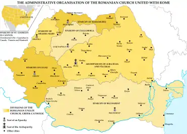 Biserica Română Unită cu Roma are patru eparhii în România (Oradea Mare, Cluj-Gherla, Lugoj și Maramureș) și una în Statele Unite ale Americii (Episcopia Greco-Catolică Română de Ohio), trecută mai recent în subordinea arhiepiscopiei majore cu sediul la Blaj.