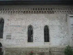 - trei ferestre înalte se află dispuse în peretele vestic al exonartexului, acestea fiind încadrate de chenare de piatră cioplită, terminate în arc frânt și decorate cu muluri gotice;