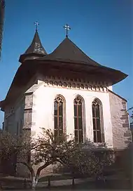 În exterior, biserica este înconjurată la partea inferioară de un soclu de piatră, înalt, și la partea superioară a fațadelor de un brâu din două rânduri de ocnițe. Absidele laterale sunt decorate cu cinci firide alungite până la soclu, iar absida altarului cu nouă firide. Biserica este luminată prin ferestre cu ancadramente gotice, dispuse astfel:[3]