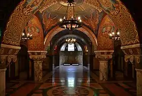 În foarte calotă a domului principal este Pantocratorul , copie a toracelui găsit în mănăstirea Gračanica . Fața lui Hristos, la 27 de metri de la etajul templului, arată impresionantă și are dimensiuni proporționale. Deși diametrul acestei picturi este de 9 metri (29 ft), și deși doar degetul lui Hristos este de 1,5 metri (5 ft), iar nasul este de 1,2 metri (4 ft) lung, totul este armonios. În altar sunt frescele cinei Domnului și drumul spre Golgota . În nișa de altar se află 5 metri (16 ft) figură înaltă a Maicii Domnului divin într-o poziție de rugăciune (copia frescei de la Mănăstirea Patriarhală din Peć ). De asemenea, există Secretul Sfintei Împărtășanie și Comuniunea Apostolilor cu Paște și Vin. Acestea sunt doar câteva dintre compozițiile care fac din interiorul bogat al bisericii.