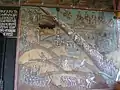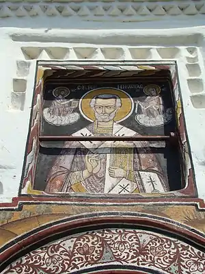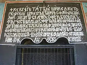 Pisania, cu frumoase săpături în piatră, are următorul cuprins: „Cu vrerea tatălui și cu ajutorul Fiului și cu săvârșirea Sfântului Duh, amin. Ziditu-s-au această sfântă biserică, întru cinstea și lauda sfântului arhiereu Nicolae, den temelie, cu toată cheltuiala robului lui Dumnezeu Jupân Drăghici căpitan Olănescu și a Jupânesei lui, Ecaterina de Oteteliș, în zilele lui Io Ion Mavrocordat Voievod și episcop al Râmnicului Kir Damaschin. Ispravnic popa Ghinea”