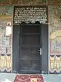 Ușa bisericii, din lemn de nuc, este formată din mai multe panouri; în partea de sus, în medalion, apar inițialele DO-Drăghici Olănescu și CO-Catrina Olănescu. În medalion este sculptat un vultur cu două capete ce reprezintă vulturul stăpânirii austriece, prezentă în Oltenia între anii 1718-1739. La mijloc, spre partea de jos a ușii, este săpat numele meșterului: Drăgoi.