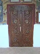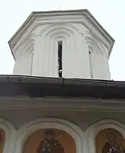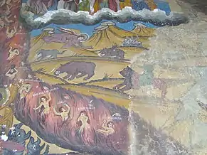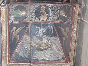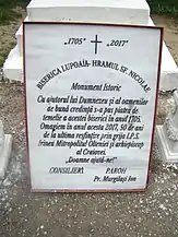 În numele sfintei făcătoare de viață și nedespărțitei treimi, cu patronajul Sfântului Ierarh Nicolae, în zilele pealuminatului domnului nostru Caragea Voievod, cu blagoslovenia prea iubitului de Dumnezeu episcopul nostru Galaction și cu toată cheltuiala și osteneala acestor ctitori s-au zugrăvit această sfântă biserică spre a lor pomenire: Nicolae Săvoiu, Iacob Săvoiu, Constantin Săvoiu, Matei Săvoiu, Ion Săvoiu, Costandinache Săvoiu, Ion Ciocănel, Dumitrașcu Săvoiu, George Săvoiu și Ion Săvoiu.