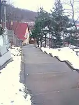Exteriorul este realizat în stil clasicist, fațadele longitudinale fiind tratate îngrijit, cu arcade oarbe.