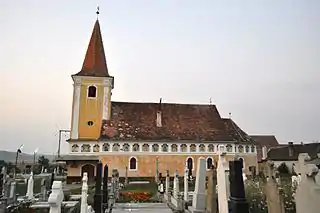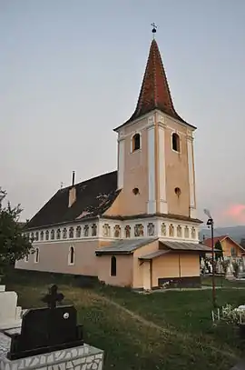 A fost ridicată în anul 1796 în stil baroc, pe o suprafață de 301 mp, cu un turn ascuțit. Biserica este construită din piatră și cărămidă și acoperită în întregime cu țiglă. A fost zugrăvită în frescă de Simion Zugravul[1], în anul 1798. Pictura murală a bisericii, semnalată de Ioan Lupaș în 1924, este astăzi dispărută.