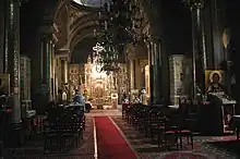 Cele cinci arcade sunt susținute de coloane dispuse câte patru pe fiecare parte. Pe prima arcadă, cea de la sfântul altar, se poate citi îndemnul “Sus sa avem inimile”. Cele două candelabre, cu coroana regală la partea superioară, sunt executate cu contribuția fostului epitrop Teodor Simeon Puzakoff.