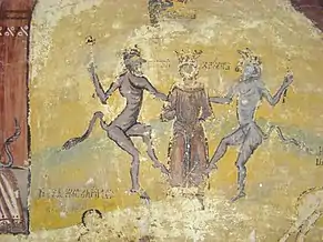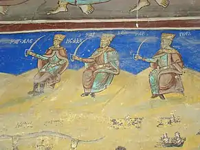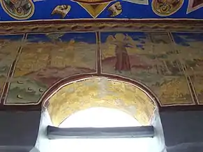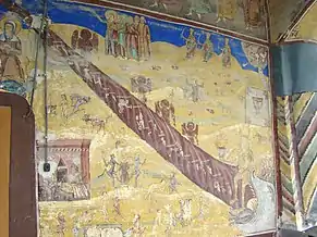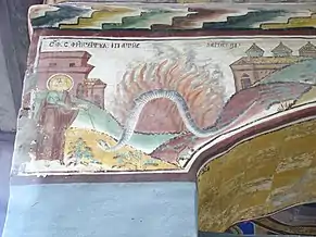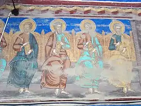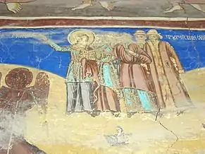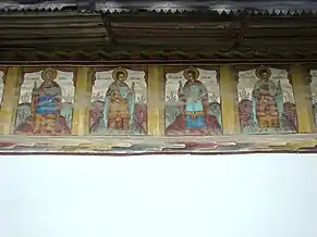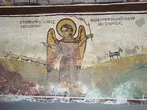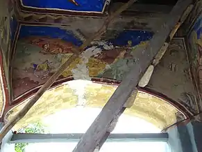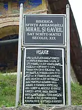„Întru slava și lauda marelui Dumnezeu și a sfinților îngeri Mihail și Gavriil, ce este și hramul, și s-a împodobit cu toată podoaba, după cum se vede astăzi, fiind mai dinainte altă biserică, zidită tot în acest loc de strămoșul meu logofătul Matei, iar acum s-a zidit din temelie în zilele principelui Alexandru Ghica caimacanul și stăpânirea sfinției sale kirul Clement al Argeșului de robii lui Dumnezeu: Antonie, Maria, Drăgușin, Săndica, Zamfir, Anghel, Tudor, Ana, Elena, în anul 1857”[2].