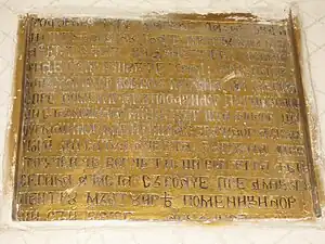 Deasupra ușii de intrare în pronaos se află o pisanie în limba română, cu caractere chirilice, având următorul text: “Todorache Ciurea, marele pa(harnic), am zidit din temelie, cu toată cheltuiala me(a), acest sf(â)nt și d(u)mnezeesc lăcaș, unde să prăznuește hram(ul) sf(i)nților mai marilor voevozi Mihail și Gavriil, spre pomenirea răposaților părinților și strămoșilor miei, căt și a fiilor și ourmașilor miei și a săracilor lăcuitori din satul acesta, rugând pre toți cei ce vor ceti și vor întra în biserica aceasta să roage pre D(u)mnezeu pentru măntuirea pomeniților și săi erte, anul 1807, mai 14”.