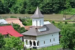 La exterior se remarcă paramentul fațadelor laterale, cu registrul superior format din ocnițe arcuite, separat printr-un tor și două brâuri zimțate de panourile dreptunghiulare ale registrului inferior.