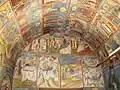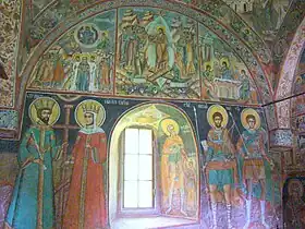 Ciclul vieții Sfântului Nicolae, episcop al Mirelor a fost ilustrat în cele două timpane de nord și de sud. Lectura debutează pe timpanul nordic. Aici sunt pictate de o parte și de alta a icoanei Sf. Nicolae, întocmai cu cea de deasupra intrării în biserică, patru scene care reprezintă Nașterea Sf.Nicolae, prima minune de după naștere, Sf. Nicolae învățacel, Sf. Nicolae preot. Ciclul se continuă în timpanul sudic cu următoarele opt scene: Sf. Nicolae îi apare lui Constantin, Pilda fecioarelor, Cei trei generali îi mulțumesc Sf. Nicolae, Sf. Nicolae îl salvează pe Vasile de sarazini, Povestea mării, Sf. Nicolae impiedică uciderea celor trei oameni, Sf. Nicolae îl salvează pe Demetrius de la înec și Adormirea Sf. Nicolae.