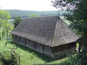 Biserica de lemn cu hramul Sfinții Arhangheli Mihail și Gavriil, adusă de pe dealul mănăstirii, unde înainte de 1765 a existat o mănăstire.