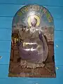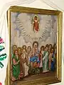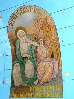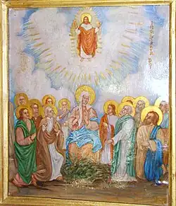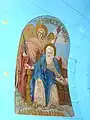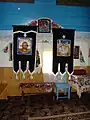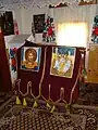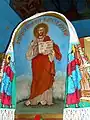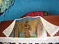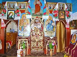Ușile împărătești sunt decorate cu motivul viței de vie și cu medalioane reprezentând chipuri de sfinți. De o parte și alta a ușilor împărătești se află „Maica Domnului cu Pruncul” și „Iisus pe tron”. În altar pereții sunt zugrăviți în alb, iar bolta, din scânduri, este zugrăvită în albastru deschis cu stele aurii. În apogeul bolții sunt zugrăvite chipuri de sfinți[2].