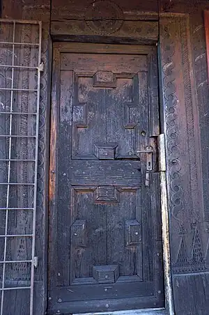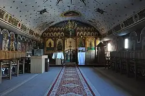 Planul construcției este dreptunghiular, cu absida decroșată, poligonală, cu cinci laturi. Sistemul de acoperire: boltă semicilindrică în pronaos și naos, retrasă de la linia pereților printr-o bârnă, cu profile crestate, închisă spre vest printr-un timpan înclinat. Pereții sunt îmbinați în coadă de rândunică, iar consolele sunt cioplite mărunt, în trepte. Din zestrea originară a bisericii a fost salvat ancadramentul intrării de pe latura sudică, bogat decorat, cu motive ornamentale care cresc din cei trei pomi ai vieții. Din patrimoniul bisericii au făcut parte icoane pictate de Iacov zugrav. În 1843 Ioan Jijin a repictat naosul, decorul pictural fiind în prezent distrus. Aceeași soartă a avut-o și pictura absidei, iar în lipsa însemnărilor nu se poate face nici o precizare de datare sau zugrav[1].