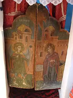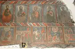 Icoanele împărătești datează din prima jumătate a secolului al XIX-lea. Pentru pictura tâmplei, care cuprinde registrele obișnuite, semnează „Cosma” în „1836 martie 16”. Icoanele din pronaos au fost repictate, în anul 1888, de preotul Rafail[10].