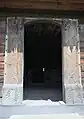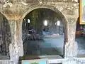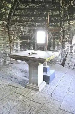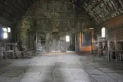 Naosul are peretii supraînălțați prin bolta sau cerimea semicirculară, împodobită la mijloc de un arc dublou, decorat prin încrestături asemănătoare cu ale celor întâlnite în Nadășu sau Aghireșu[2].