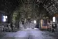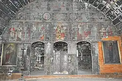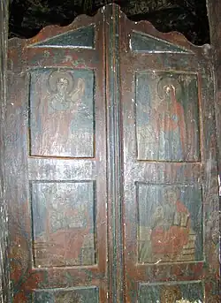 Iconostasul se înalță până sub cerime, separând bolta altarului, de aceeași înălțime pe porțiunea pereților paraleli, dar continuată apoi prin obișnuitele triunghiuri sferice.