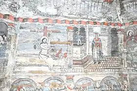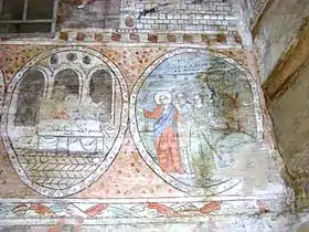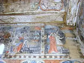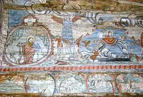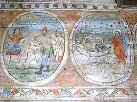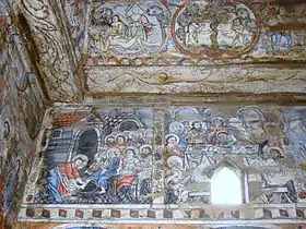 Pictura naosului se caracterizează prin reprezentarea în paralel a „Genezei”, în 20 de episoade extrem de detaliate și a ciclului „Patimilor”, în 18 episoade.