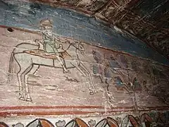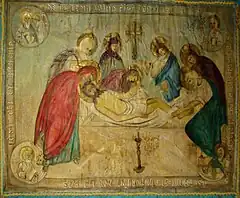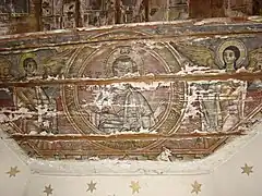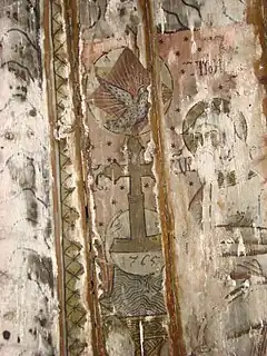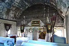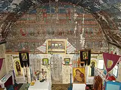 În absidă se păstrează fragmentar pictura murală datată pe boltă cu cifre arabe în 1765, realizată de un artist talentat, având un desen sigur și viguros. Pictura tâmplei aparține unui alt pictor din a doua jumătate a veacului al XVIII-lea, care mai păstrează în stilul său unele elemente de tradiție brâncovenească[2]. Naosul conservă o parte din pictura murală, în special pe bolta cilindrică. Mai multe icoane pictate pe sticlă provin din centrul de pictură de la Nicula.