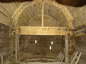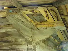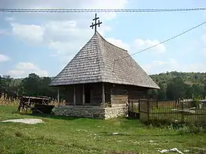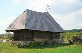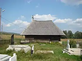 Lăcașul a fost conceput fără prispă și clopotniță. Prispa de 1,14 m[4] a fost adăugată ulterior, momentul fiind consemnat de o inscripție săpată pe o bârnă din dreapta intrării: „leat 7208 am scris eu popa Mihai” (1771-1772)[5]. Se remarcă prin valențele artistice: stâlpi cu fus poligonal și romburi adâncite pe muchiile capitelului, fruntarul și cosoroabele adânc crestate și ornamntate cu striuri și alte motive decorative, stenapii împodobiți cu profilul „în frânghie” și chenare[6].