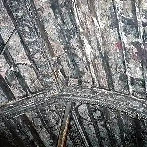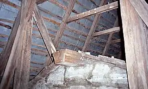 Tinda este astăzi tăvănită sub tălpile turnului însă urmele de pictură din pod și cioplitura frumoasă în partea de sus a pereților sugerează că tinda a avut inițial fie o altă acoperire interioară fie a fost lăsată deschisă spre pod.