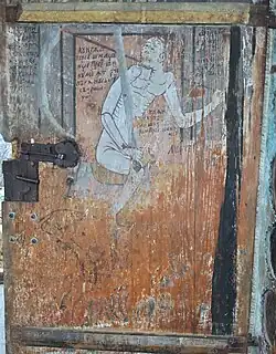 Pe spatele ușii de la intrare există o pictură reprezentând moartea cu coasa, alături de câteva inscripții moralizatoare (autorul picturii este necunoscut).